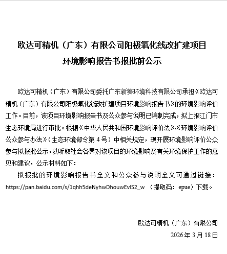 欧达可精机(广东)有限公司阳极氧化线改扩建项目 环境影响报告书报批前公